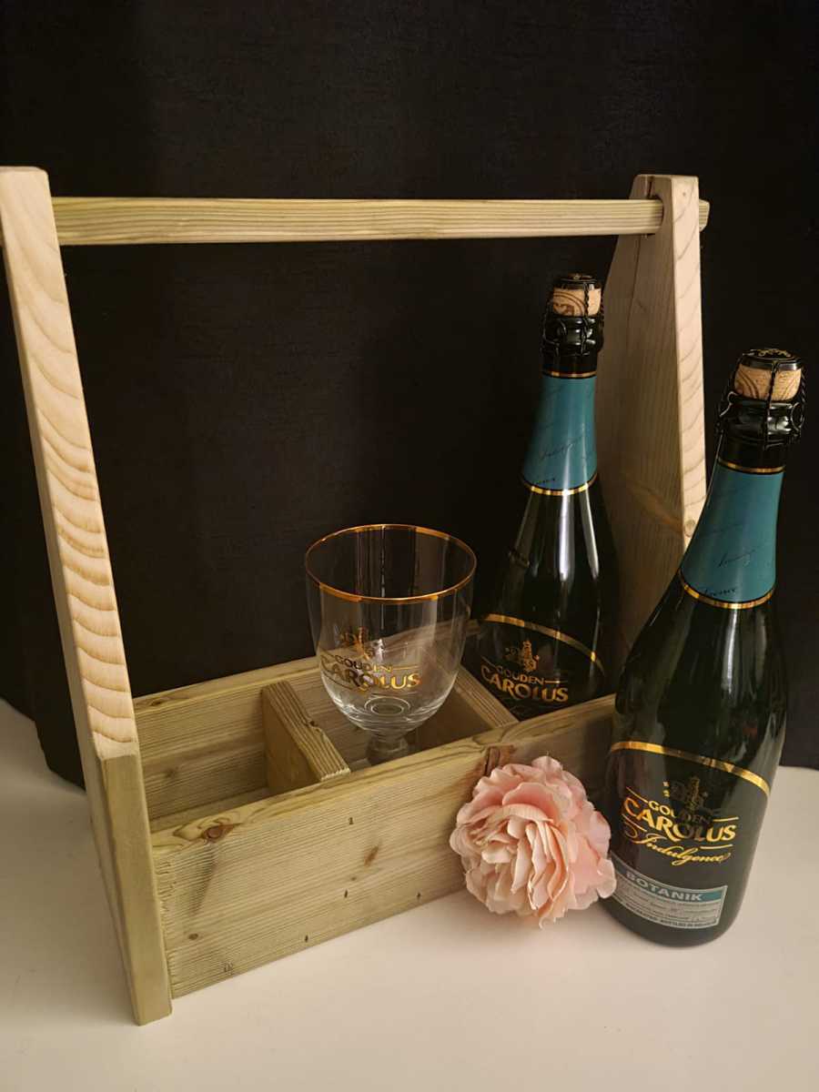 Een mooie giftset dat bestaat uit een houten draagrek, 2 overheerlijke bieren en het bijbehorende glas. Het draagrek is gemaakt van resthout dat anders zou worden weggegooid. Het draagrek is zeer degelijk gebouwd en kan jaren mee. Naast dat het gebruikt kan worden om de bieren in te geven is het later ook decoratief bruikbaar maar ook leuk om bijvoorbeeld kruiden in te zaaien of bloemen in te planten.