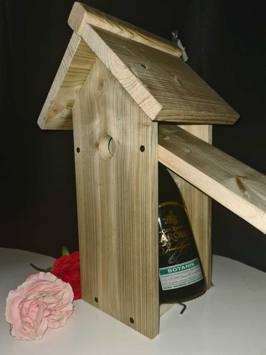 Unieke manier om een bijzonder cadeau te geven. Ecologisch vogelhuis met een bijzondere fles Gouden Carolus Indulgence Botanik uit 2017!